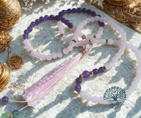 A szerelem vonzása mala, 108 szemes imafüzér ametiszt és rózsakvarc ásványokkal