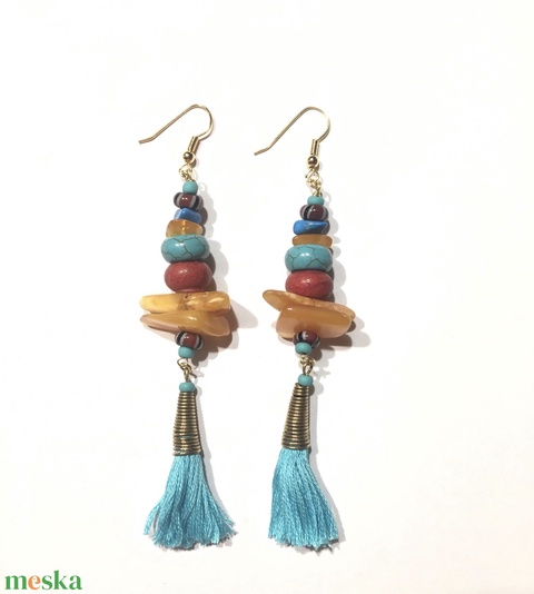Borostyános, türkiz rojtos fülbevaló howlithtal, csíkos üveggyöngyökkel pamut rojttal