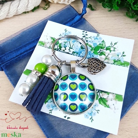 Szívörvény kék bojtos üveglencsés kulcstartó táskadísz