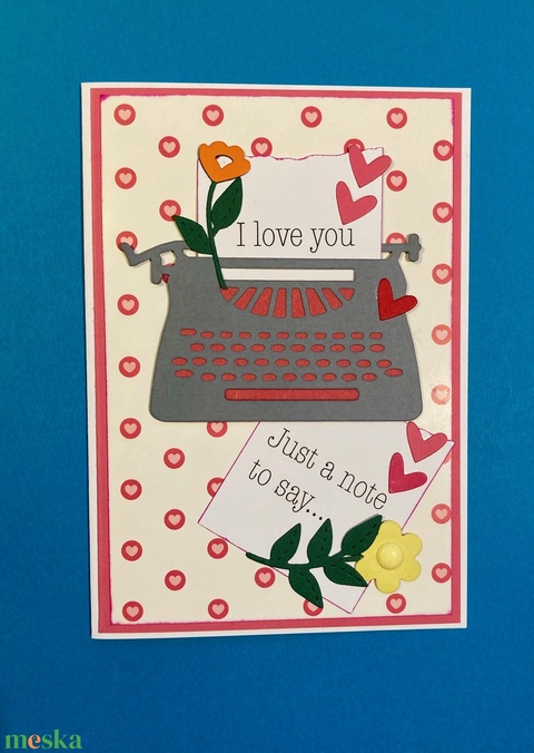 Szerelmes képeslap, Valentin nap,retró, írógép, virág, ajándékkísérő, szív