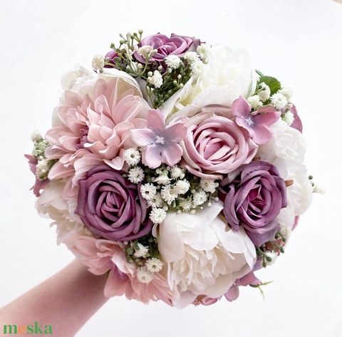 Selyemvirág menyasszonyi csokor mályva