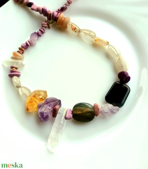 Levendula lila, aranysárga, fehér transzparens ásványkő nyaklánc