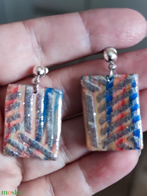 Kék, narancssárga, piros csíkos fülbevaló ezüst geometriai mintával díszítve