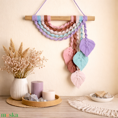 Makramé levélkés falidísz - Pasztell színek