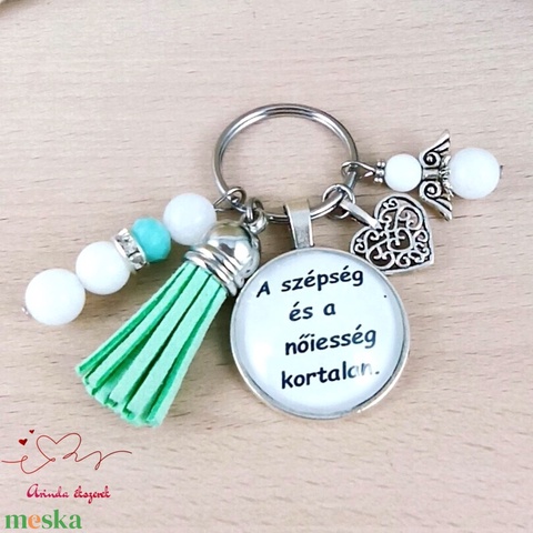A szépség és a nőiesség kortalan feliratos angyalkás üveglencsés kulcstartó
