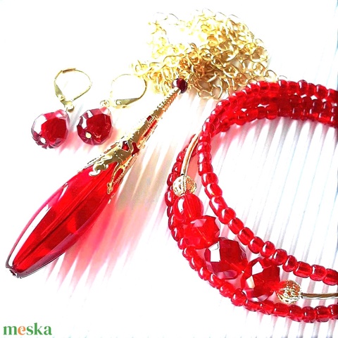 AKCIÓS! - Arany csipkés rubin gyöngy-csepp medál, karkötő és franciakapcsos fülbevaló, üveggyöngy ékszerszett