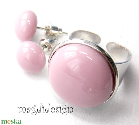Keretbe zárt lilás-rózsaszín üvegékszer szett, gyűrű, stiftes fülbevaló