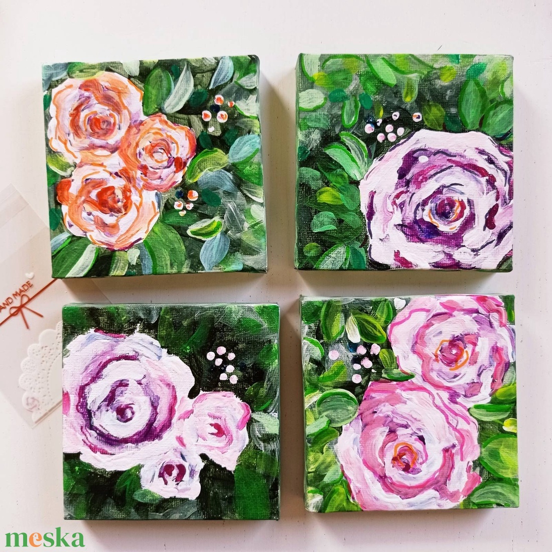 Virágos, rózsás egyedi mini festmények díszcsomagolásban - köszönetajándék a násznépnek – monogrammal, dátummal