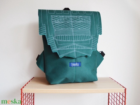 Smaragd zöld vízlepergető kicsi hátizsák épület mintával