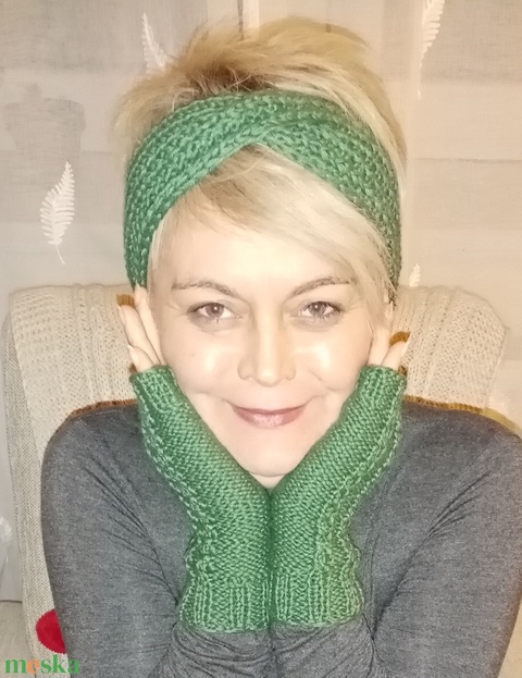 Fejpánt, kézmelegítő kézzel kötött közép zöld