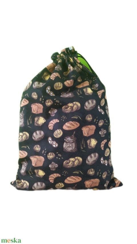 Nagy méretű kenyereszsák, frissentartó zsák, pékárus zsák-Fekete alapon pékáru mintás