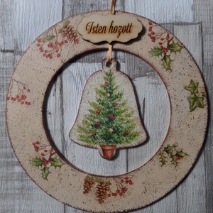 Téli,karácsonyi koszorú alakú ajtódísz,üdvözlőtábla harang alakú függővel fenyő,erdei termések mintával