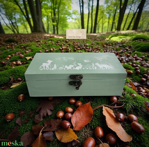 Pasztell zöld, egyedileg festett, erdei állat mintás emlékőrző fadoboz - Artiroka design