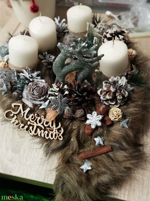 - Anyaga: műszőrme, széna alap, gyertya,gyertya tüske, termések, rénszarvas