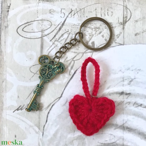 Kulcstartó antikolt sárgaréz Mickey Mouse, Miki egér füles kulccsal, horgolt szívvel - Kisherceg design
