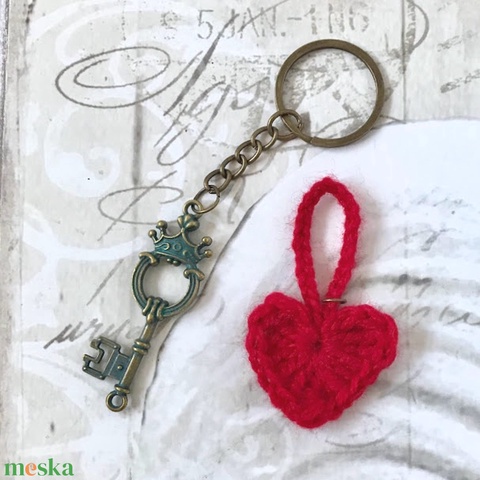 Kulcstartó antikolt sárgaréz koronával díszített kulccsal, horgolt szívvel - Kisherceg design