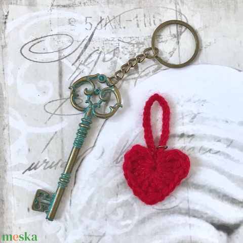 Kulcstartó antikolt sárgaréz virágos szecessziós kulccsal, horgolt szívvel - Kisherceg design