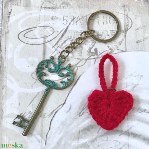 Kulcstartó antikolt sárgaréz virágos szecessziós kulccsal, horgolt szívvel - Kisherceg design