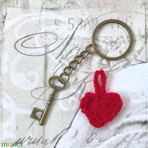 kulcstartó, antikolt sárgaréz szívecskés kulccsal, horgolt szívvel - Kisherceg design