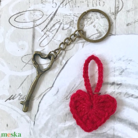 Kulcstartó antikolt sárgaréz absztrakt szíves kulccsal, horgolt szívvel - Kisherceg design
