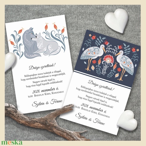 Skandináv jellegű, folk art stílusú állatok párosai. Ezeken a mintákon virágmotívumok keretezik a párokat, de ha egyszerűbbet szeretnél, természetesen kérheted enélkül is, csak az állatokat a meghívódra. Illetve a grafika hátterének színe is módosítható.