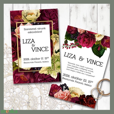 Vintage jellegű virágok díszítik ezeket a meghívókat.