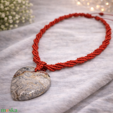 Piros makramé nyaklánc, szív alakú jáspis kővel