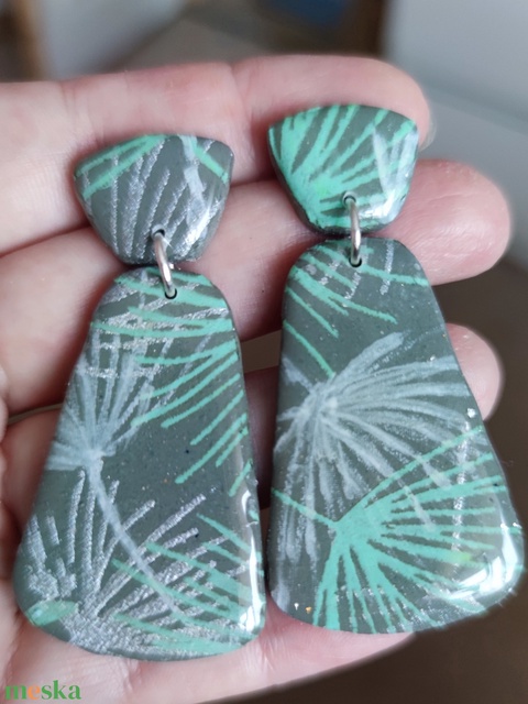 Szürke, alig észrevehetően csillogó alapon zöld, ezüst és fehér fű mintás, fényes felületű fülbevaló