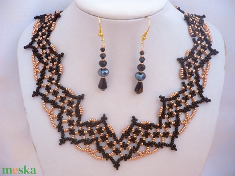 fekete-arany alkalmi csipkeszerű gyöngy nyakék-fülbevaló szett, szilveszter, karácsony, gyöngynyaklánc, ajándék