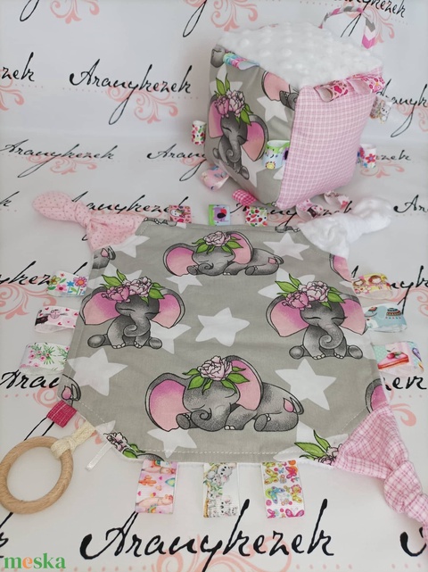 Elefántos-rongyi-cimkekendő-babakockával szettben