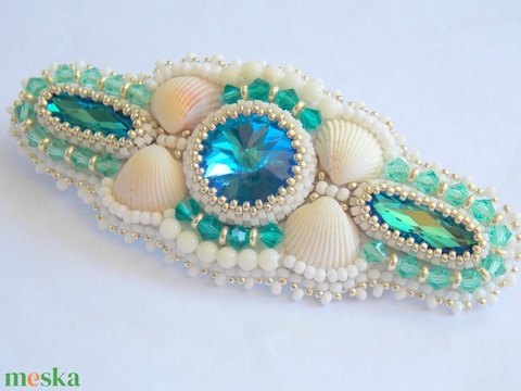 báránybőr, preciosa gyöngy, francia csat alap, rivoli, baugette, kagyló, bambusz corall, bicon, delica, toho kása