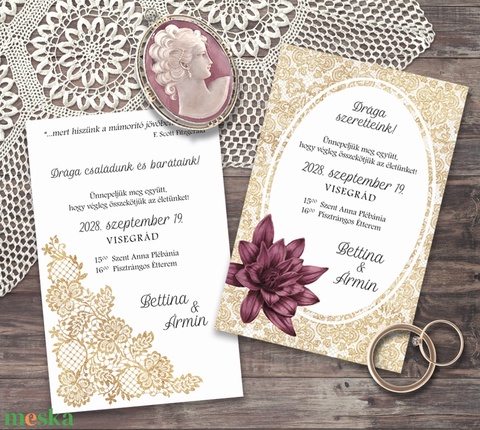 A meghívó alapjául óarany színű csipkeminta szolgál. Ha nem szereted az aranyat, a csipke más színű is lehet - küldd el az elképzeléseidet üzenetben!