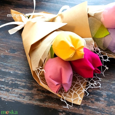 Textil tulipán csokor natúr csomagolásban 3 szál/cs, örökcsokor, egyedi összeállítás