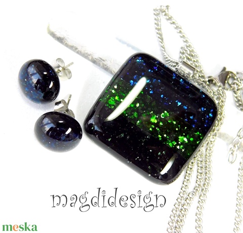 Kék-zöld-fekete csíkos aventurin üvegékszer szett nyaklánc, pötty fülbevaló