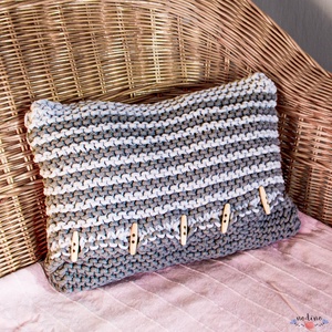 Puha, szürke csíkos, zsinórfonalból kötött díszpárnahuzat fagombokkal díszítve (43 x 30cm)