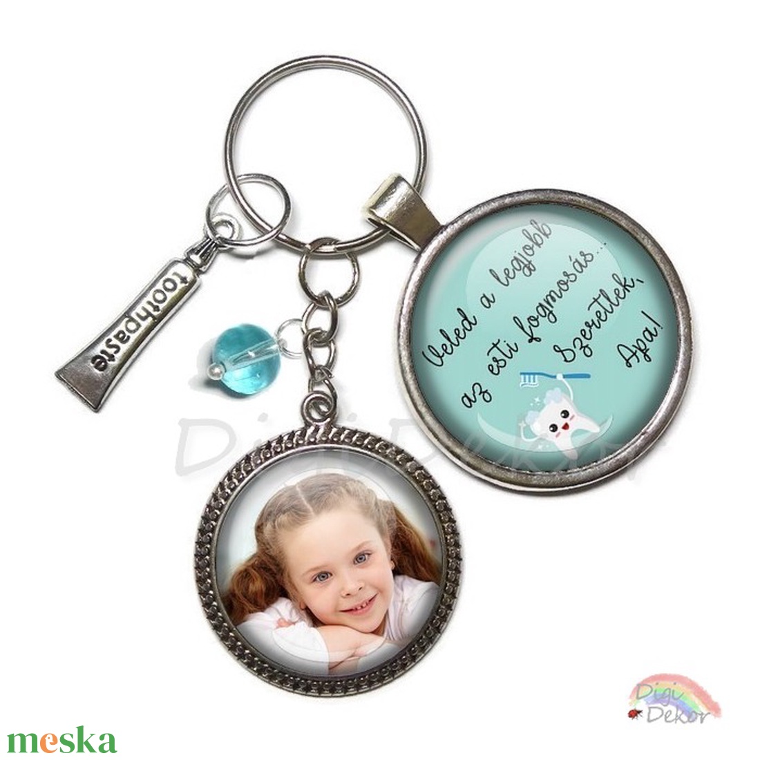 Személyes apák napi ajándék, fényképes, feliratos kulcstartó két medállal, ajándék apukáknak, fogkrém, fogmosás