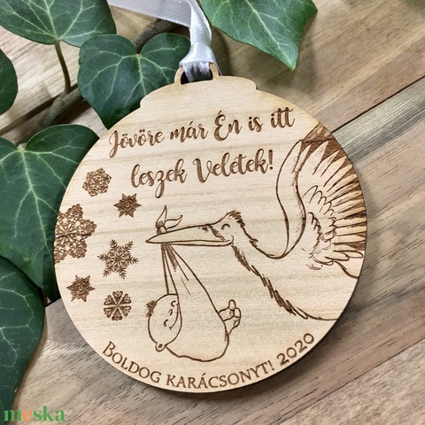 Bababejelentő karácsonyfadísz, tömör cseresznyefából