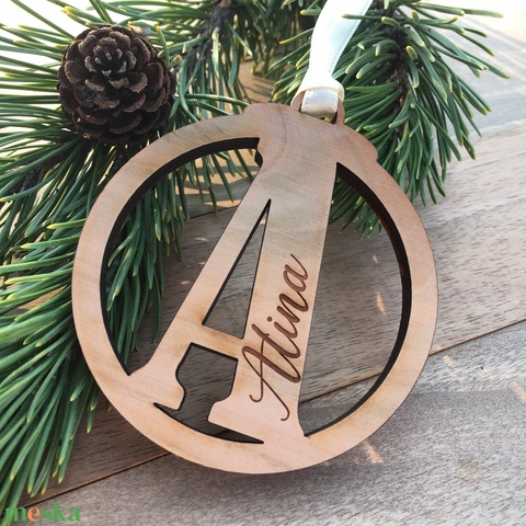 Tömör fából készült karácsonyfadísz tetszőleges betű kivágásával, gravírozással