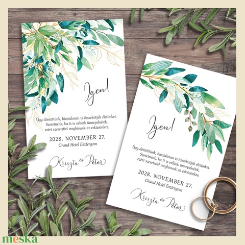 Zöldleveles ágak díszítik ezeket a meghívókat. A sokféle zöld árnyalattól vibráló és trendi a végeredmény. A többféle elrendezés közül válaszd ki a hozzád legjobban illőt!
