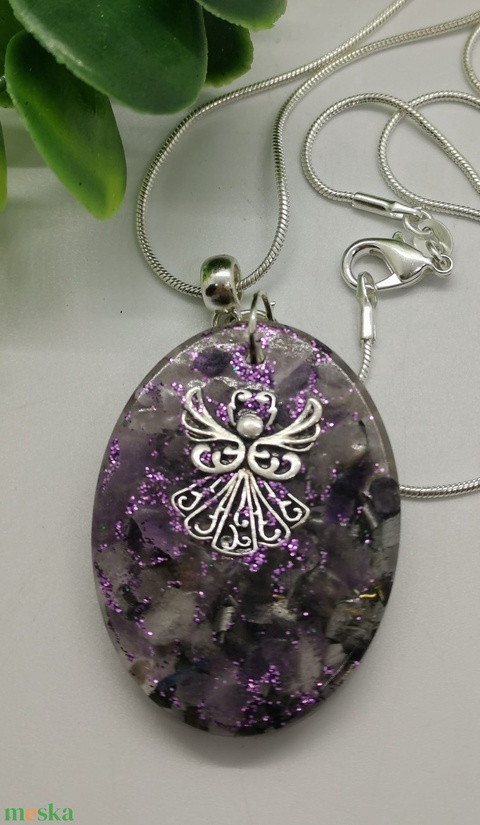 Nagy ovális ametiszt orgonit medál ametiszttel angyalkával 925 ezüst sterling lánccal