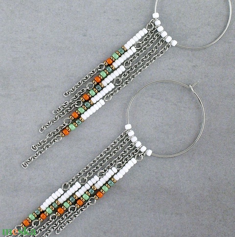 Hosszú, rojtos fülbevaló, Fehér gyöngyös karika fülbevaló láncrojttal, Nemesacél fülbevaló, Bohém női ékszer