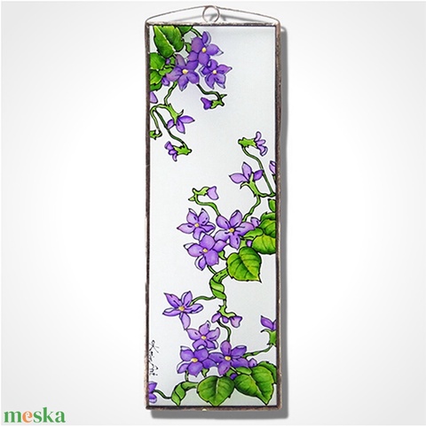 Üvegre festett, rézfóliával keretezett üvegfestmény, üvegkép. Réz vagy antikolt kerettel.