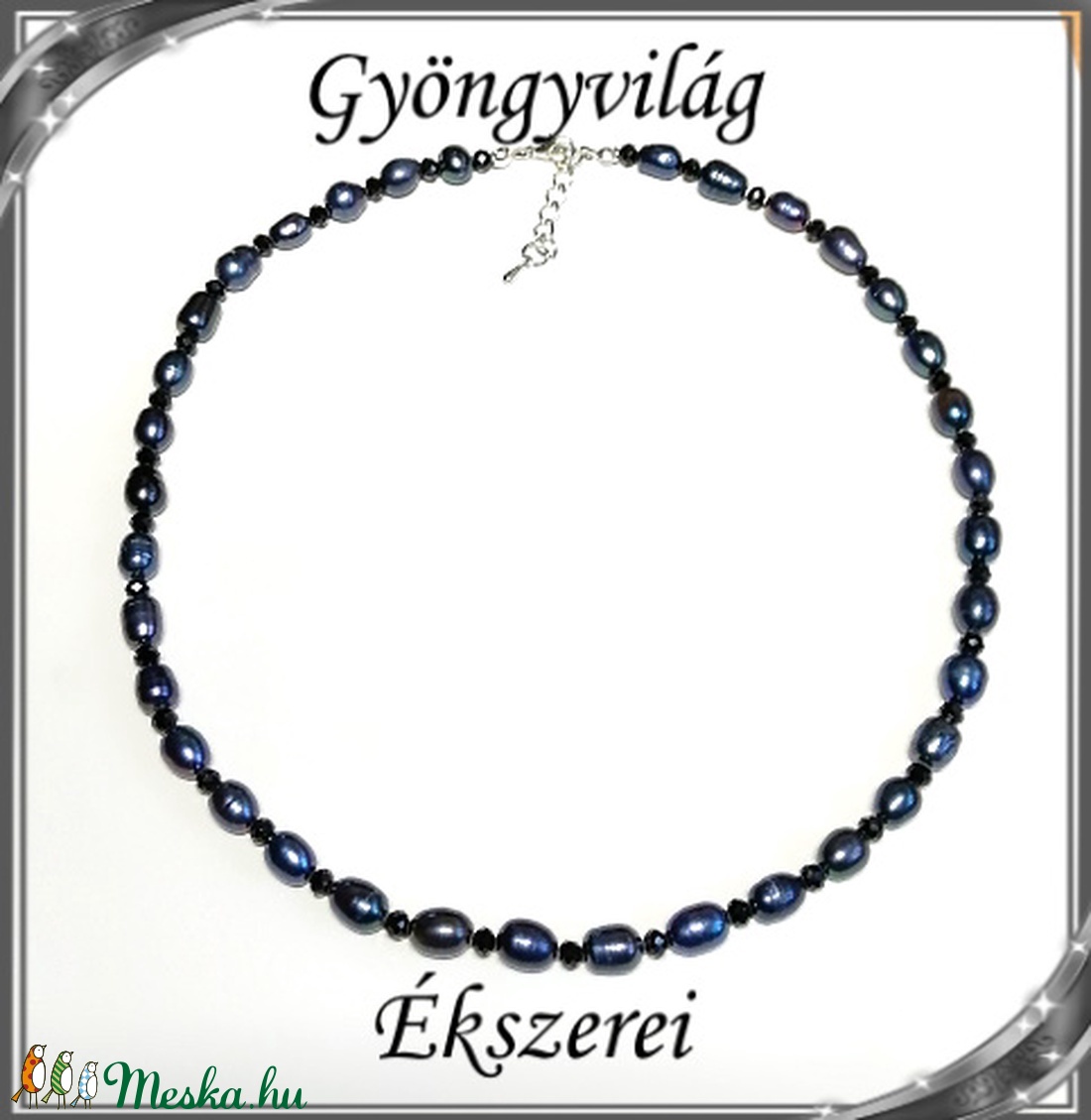 igazgyöngy, ródiumozott lánckapocs, ródiumozott lánchosszabbító, cseh kása gyöngy, selyem szál, gyöngy