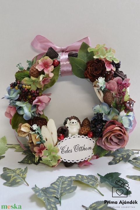 - Anyaga: koszorú alap, szárított termések, selyemvirág