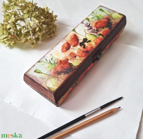 Pipacsmező - fa tolltartó fémdísszel vintage stílusú tároló-, ballagás, ajándék, pedagógusnak, ballagásra