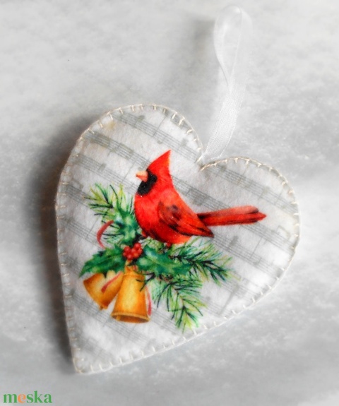Vintage stílusú szív alakú karácsonyfadísz (kardinális pinty)