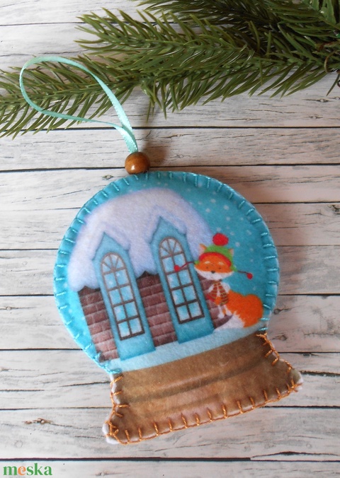 Különleges hógömb alakú karácsonyfadísz (házikós-rókás)