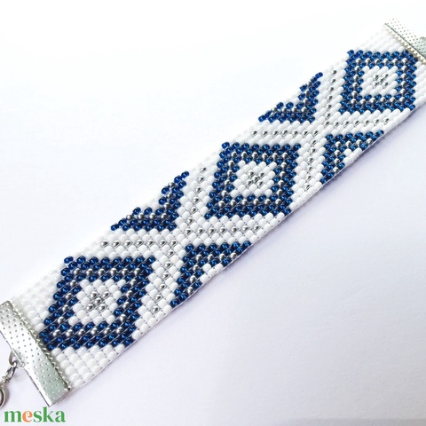 Kék-fehér-ezüst gyöngyszövött karkötő