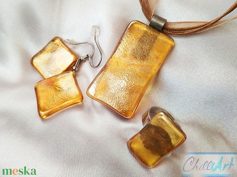 Csillogó arany minimal design nikkelmentes szett - Irizáló arany üvegékszer medál fülbevalóval és gyűrűvel