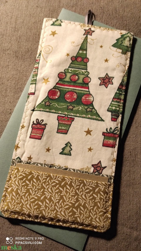Karácsonyfás üdvözlőlap, textilkép, pénzboríték
